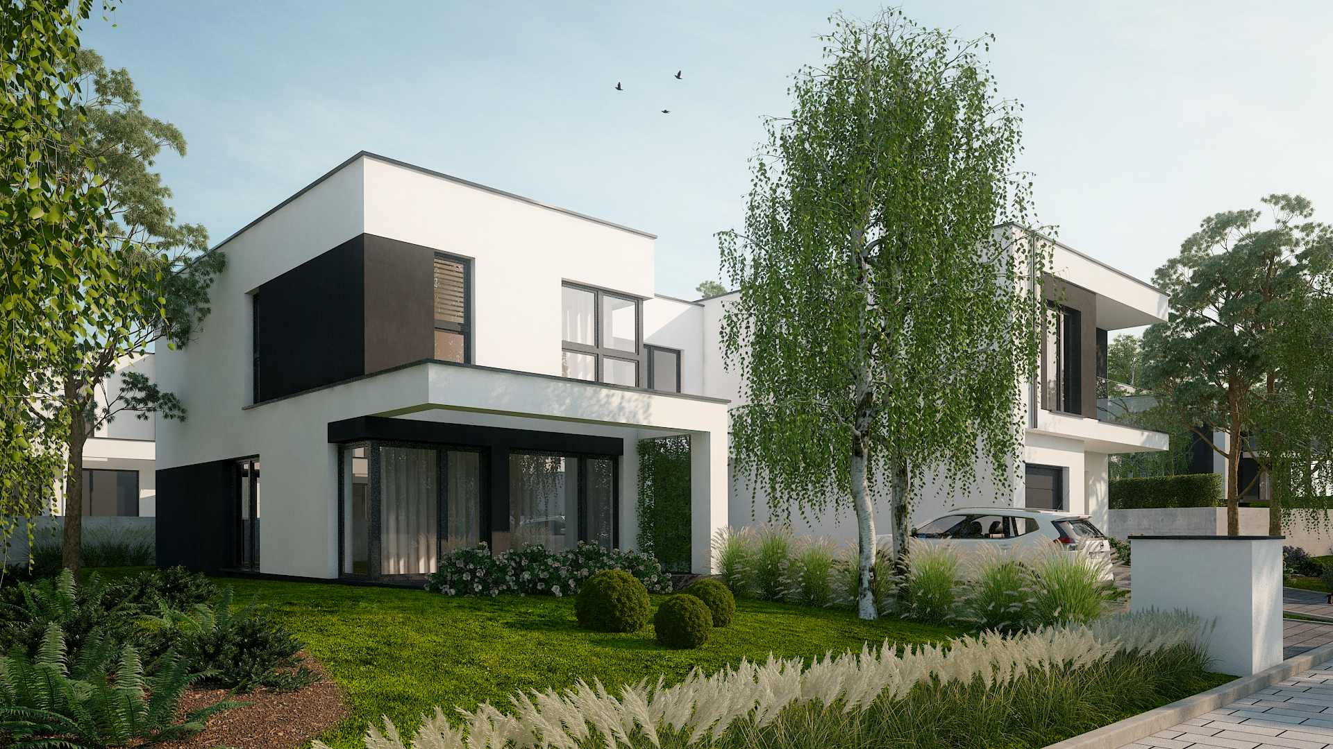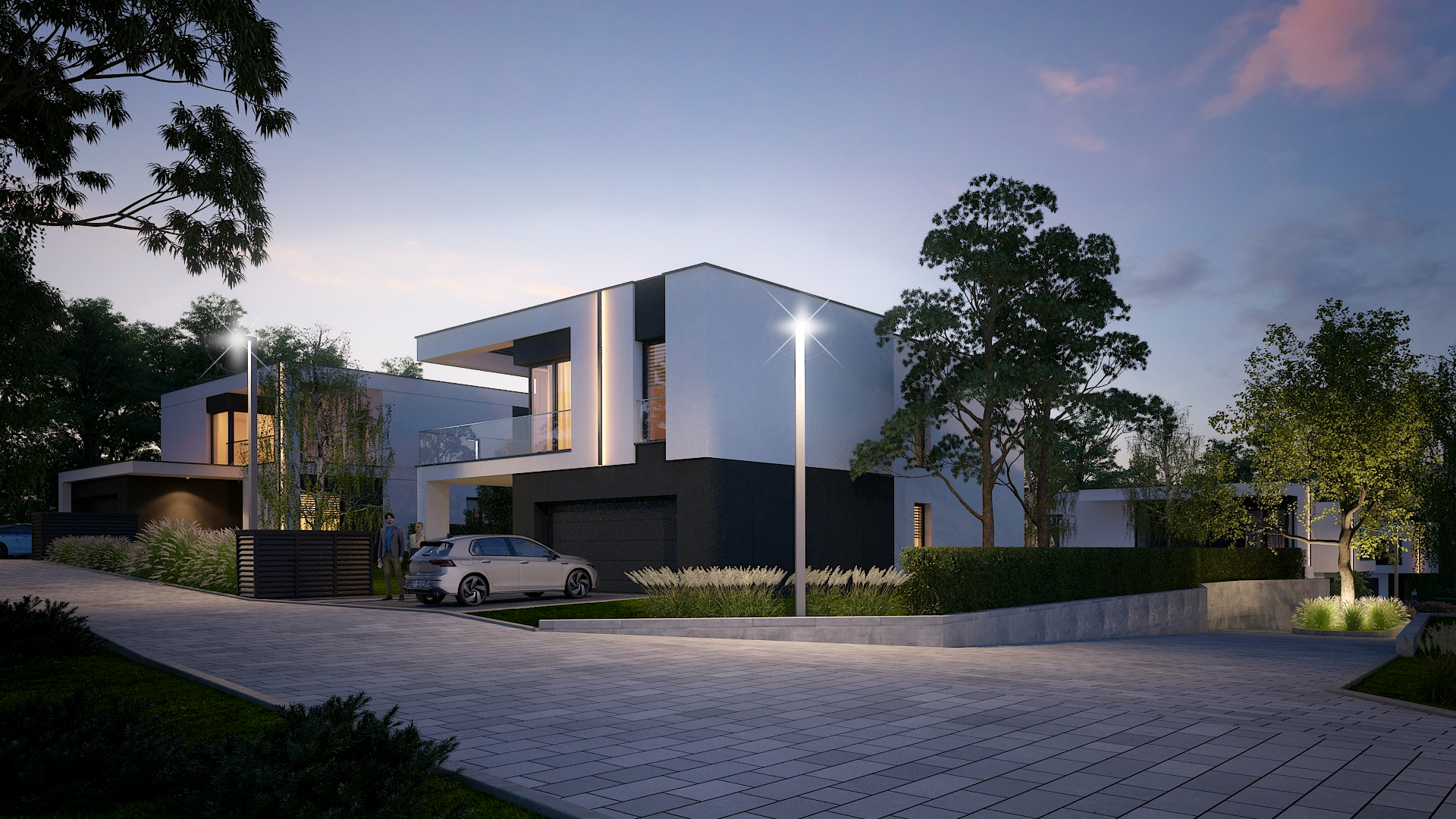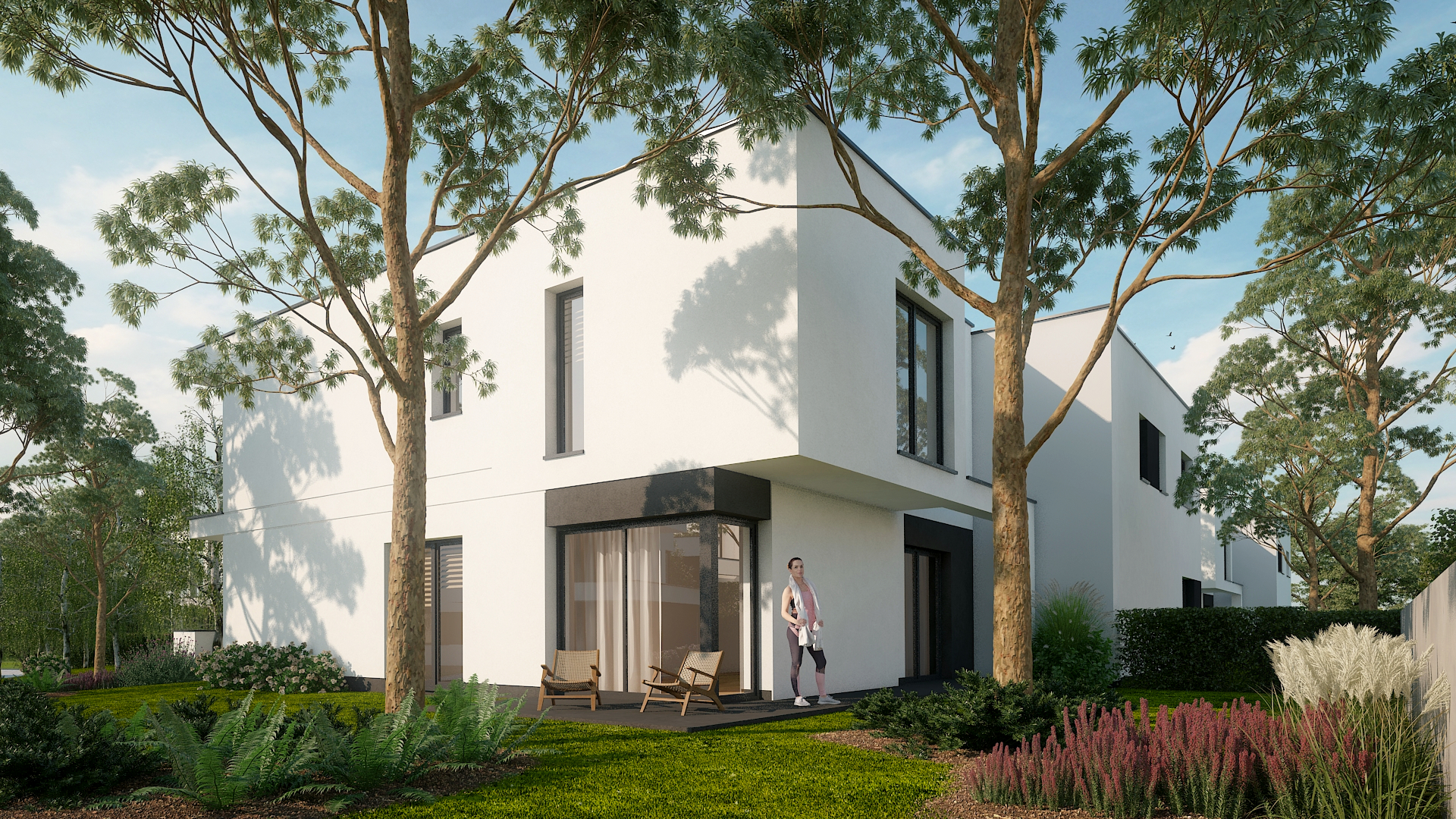 Dodajmy do tego wysublimowane wzornictwo, rozkłady pozwalające mieszkać niezwykle wygodnie oraz bardzo duże przeszklenia, a tworzy nam się obraz miejsca niezwykłego. Przewidzieliśmy również całościowe ogrzewanie podłogowe w każdym z domów, a także pompy ciepła jako źródło ogrzewania, czyli większe bezpieczeństwo energetyczne oraz bardziej ekologiczna energia.